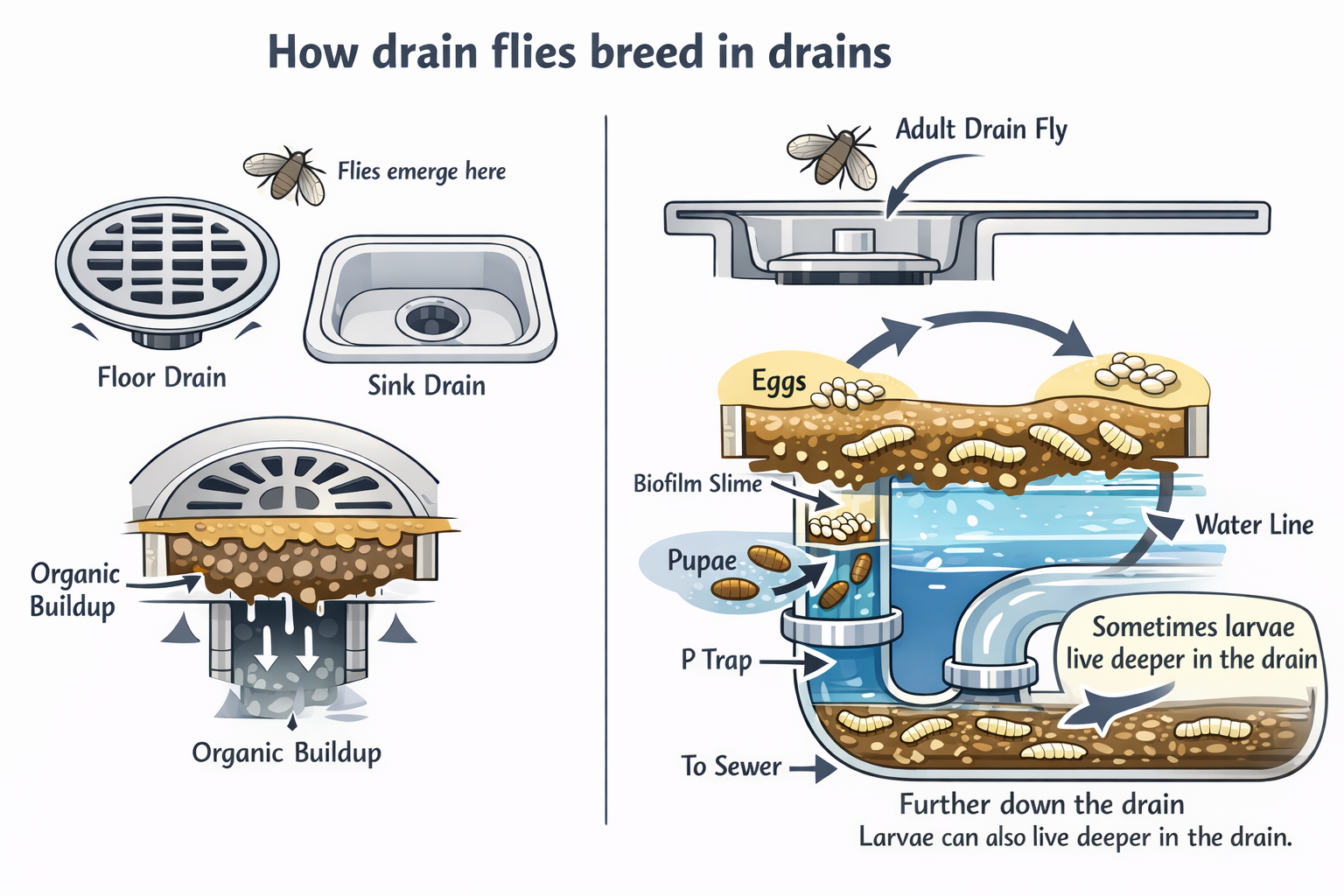 What happens is this. Over time, drains build up this slimy organic layer on the inside of the pipe. It is basically a mix of grease, soap residue, food particles, and whatever else goes down that drain. That buildup is called biofilm, and it is the perfect breeding zone for drain flies. They lay eggs in it, the larvae feed in it, and then you keep getting new adults coming out. So you might feel like you are losing your mind because you killed ten yesterday, but then today there are ten more. That is why.